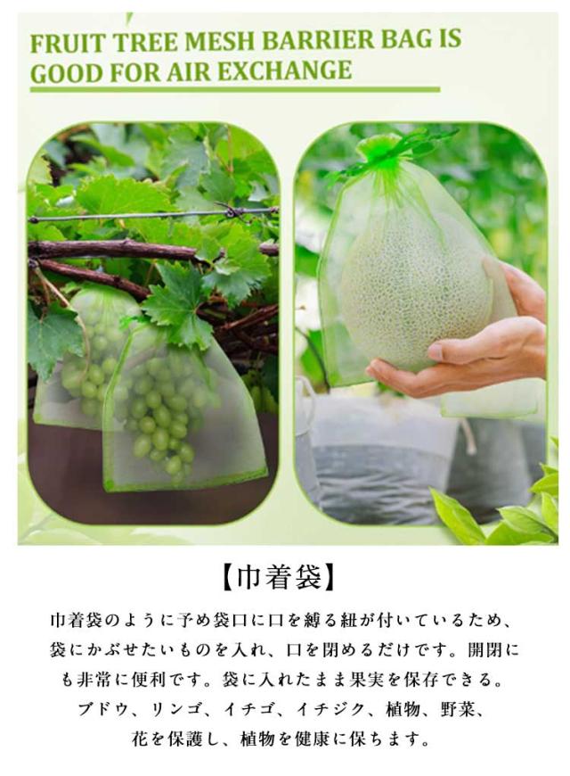 | 【果物保護袋】 【50枚入り】 虫や鳥から丹精込めて育てた果物を守る防虫、防鳥ネットです。栽培するものによって必要になるサイズが異なることから、大きさが違う2種類のネットをご用意いたしました。 【大容量】 内容枚数は50枚と大容量のため、枚数を必要とする農家さんにおすすめです。使い回しも効き、たくさんの果物をカバーできるので安心です。 【巾着袋】 巾着袋のように予め袋口に口を縛る紐が付いているため、袋にかぶせたいものを入れ、口を閉めるだけです。開閉にも非常に便利です。袋に入れたまま果実を保存できる。ブドウ、リンゴ、イチゴ、イチジク、植物、野菜、花を保護し、植物を健康に保ちます。 【強化ナイロンで頑丈】 専用の高品質ナイロンで、大切な果物や野菜をしっかりガードします。耐腐食性に優れ、無袋で栽培した果実よりも老化、日焼け防止に効果があることから痛みが少ない状態で収穫することができます。通気性は抜群なので果物を傷める心配もありません。 用途: 通気性が良いメッシュ素材を使用しているため、害虫、害鳥対策だけでなく、種びたし、催芽、花粉単離、種子保管、完熟栽培の促進など様々な用途でご使用いただけます。 【通気性が良いメッシュ素材】害虫、害鳥対策だけでなく、種びたし、催芽、花粉単離、種子保管、完熟栽培の促進など様々な用途でご使用いただけます。 | |