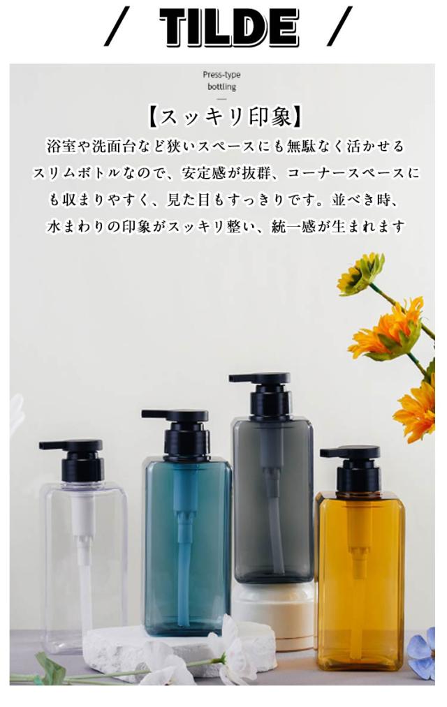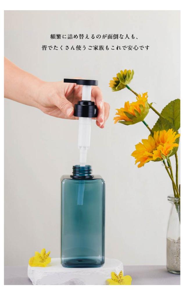 | 2本セット! 【750ml】一般的なサイズの詰め替え容器より大きめ、余裕をもって入れることができます。 頻繁に詰め替えるのが面倒な人も、皆でたくさん使うご家族もこれで安心です 衝撃に強いPET素材を使用していますので、軽くてご家族みんな扱いやすい素材です。 クリアなのでどのくらい入っているかも一目瞭然です。 シンプルでおしゃれなバスルームと似合うデザインで作られます。ポンプ部分は使いやすく、程よい量がちゃんと出てきます 【スッキリ印象】浴室や洗面台など狭いスペースにも無駄なく活かせるスリムボトルなので、安定感が抜群、コーナースペースにも収まりやすく、見た目もすっきりです。並べき時、水まわりの印象がスッキリ整い、統一感が生まれます | |