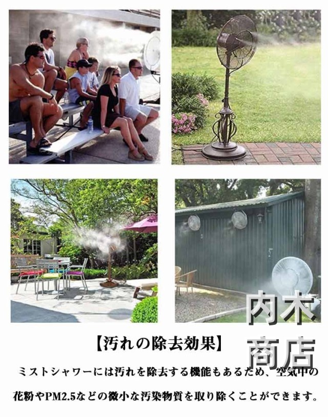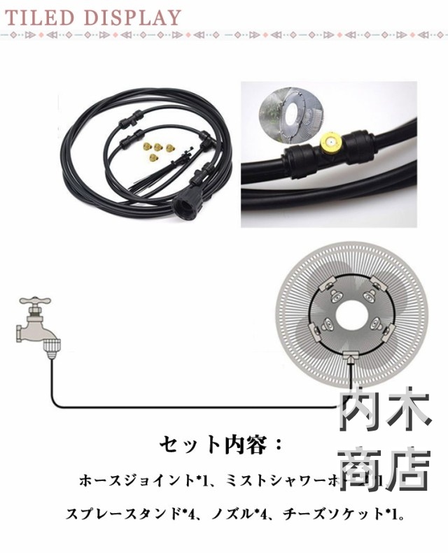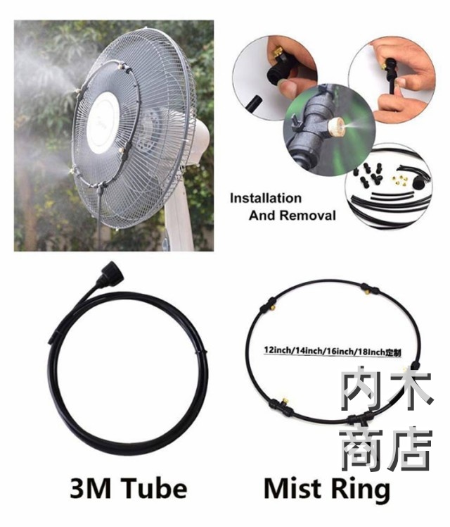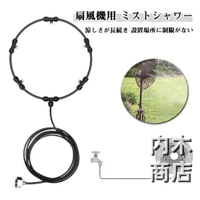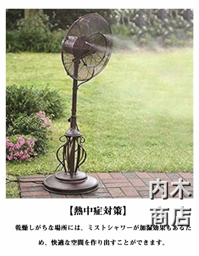 | 扇風機用 ミストシャワー セット内容:ホースジョイント*1、ミストシャワーホース*1、スプレースタンド*4、ノズル*4、チーズソケット*1。 【涼しさが長続き】ミストシャワーで水分を微粒子化し、風に乗せて送風することで、涼しさが長続きします。 【熱中症対策】乾燥しがちな場所には、ミストシャワーが加湿効果もあるため、快適な空間を作り出すことができます。 【汚れの除去効果】ミストシャワーには汚れを除去する機能もあるため、空気中の花粉やPM2.5などの微小な汚染物質を取り除くことができます。 【健康にも良し】ミストシャワーによって、空気中の湿度が正常に保たれるため、喉や肌などの乾燥から守ることができ、健康にも良い効果を発揮します。 【設置場所に制限がない】一般的なエアコンとは異なり、設置場所に制限がないため、自宅や職場などで自由に利用できます。 | |