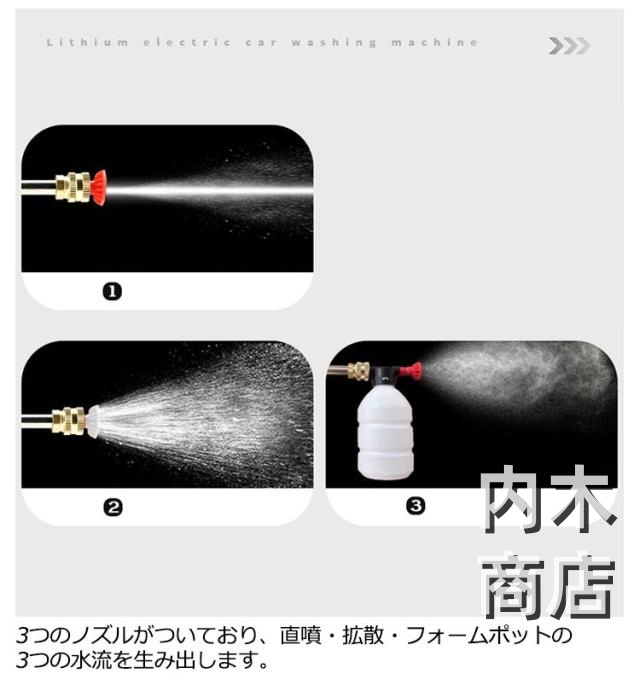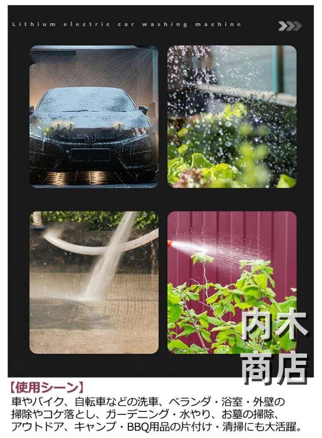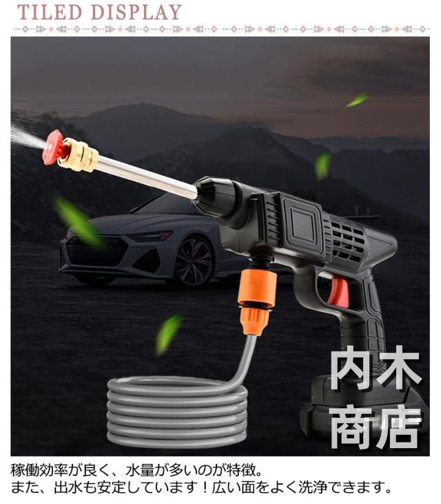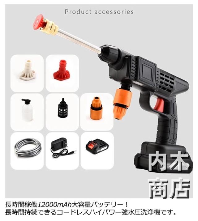 | 【充電式高圧洗浄機】【12000mAh大容量バッテリー】【収納ケース付】 稼働効率が良く、水量が多いのが特徴。また、出水も安定しています!広い面をよく洗浄できます。 持ち運びが簡単で、様々な水源から水を汲み上げることができます。 長時間稼働12000mAh大容量バッテリー!長時間持続できるコードレスハイパワー強水圧洗浄機です。 取り回しが良い充電式コードレス高圧洗浄機なので、電源がない場所でも使用可能です。 バケツなどに入れた水をくみ上げる吸水タイプで、専用タンクがないので場所を選ばず使えます。 3つのノズルがついており、直噴・拡散・フォームポットの3つの水流を生み出します。 圧力ノズルと組み合わせることで、さまざまな作業に対応でき、環境に応じた洗浄方法を選択できます。 【使用シーン】車やバイク、自転車などの洗車、ベランダ・浴室・外壁の掃除やコケ落とし、ガーデニング・水やり、お墓の掃除、アウトドア、キャンプ・BBQ用品の片付け・清掃にも大活躍。 | |