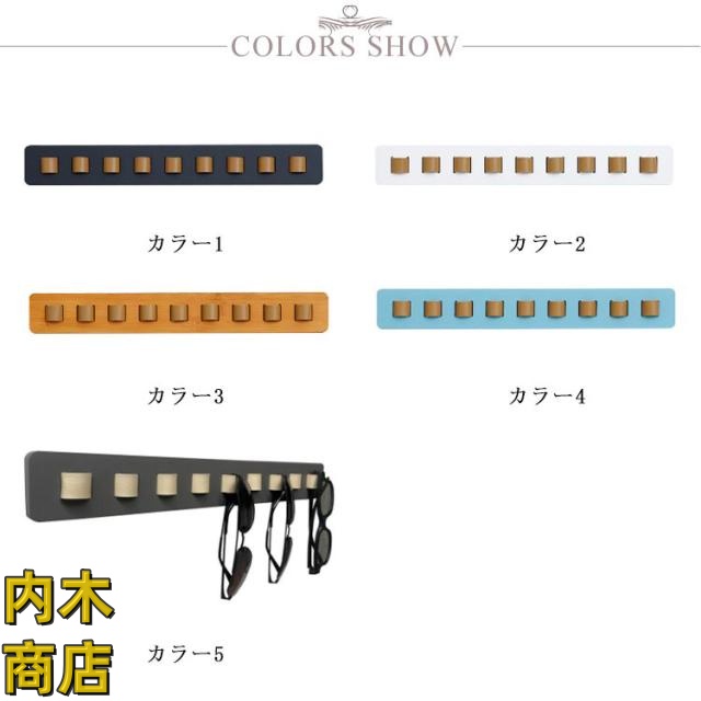 | 全5色、シンプルでスタイリッシュなフォルムは オブジェとしても壁面をオシャレに演出します! メガネを9本も掛けられて驚きの省スペース。 取り付けビス穴は2ヶ所(両面テープ付き、貼り付けだけもOK!)なので、壁にあまり穴を開けたくない方にもオススメです。 | |