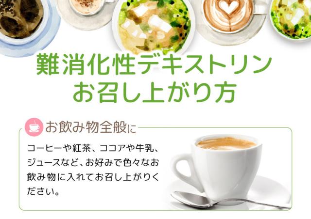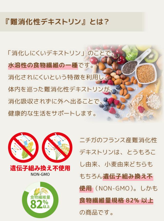 「難消化性デキストリン」とは、「消化しにくいデキストリン」ということで、水溶性の食物繊維の一種です。