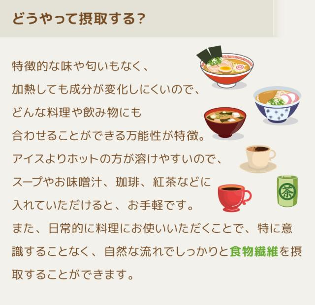 こちらの製品は、遺伝子組み換え不使用(NON-GMO)で、食物繊維量規格82%以上の品です。手軽に高品質な食物繊維を摂取できますので、健康管理やダイエットなどニーズに合わせて様々な用途にご活用下さい。