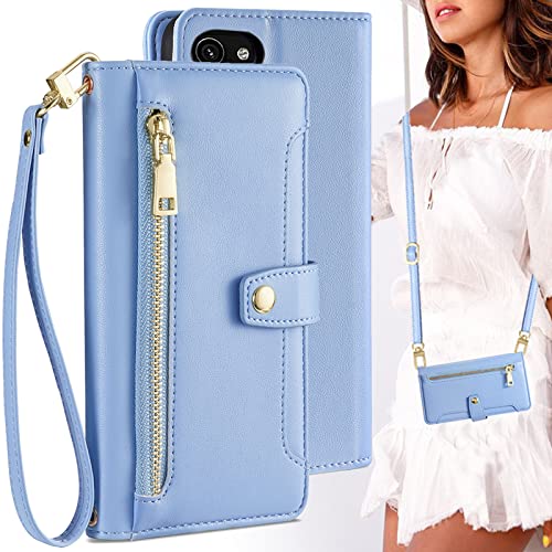 Google pixel 3a ケース 手帳型 ショルダーケース カードケース ショルダー ストラップケース [ストラップ 長+短 2本] ストラップホール付き カード収納 マグネット スナップ 肩がけ 首掛け 斜め掛け ファスナー 耐衝撃 浅い藍 ライトブルー