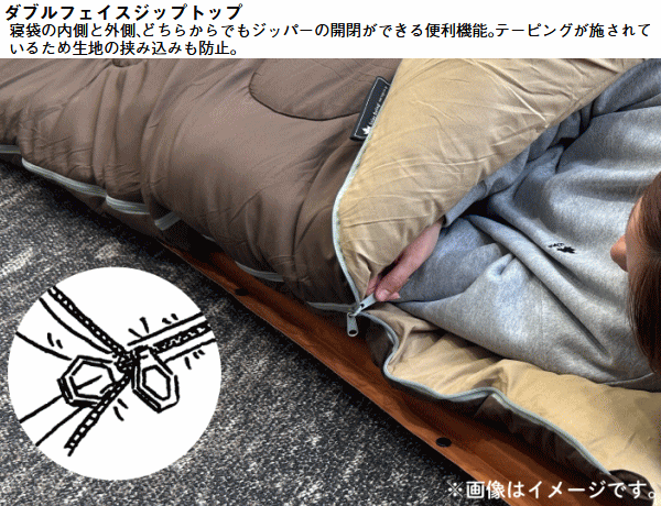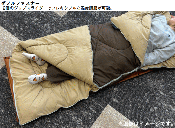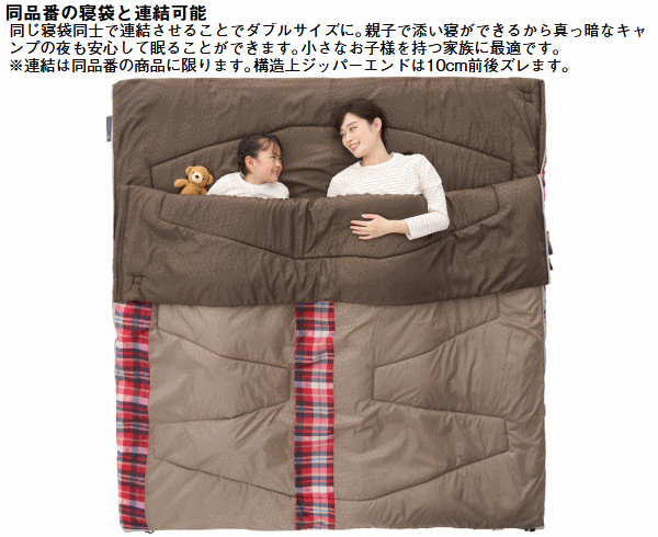 胸囲120cmでもOK!大きな人でも余裕の超ワイド寝袋。体が大きい方でも窮屈さを感じず快適に眠れる超ワイドサイズの寝袋。幅はゆとりのある95cm、適合胸囲は約120cmまで対応しており寝返りも楽にできる設計。一般的な寝袋では圧迫感が気になるという方にもおすすめ。対応温度は2℃までと春や秋はもちろん少し肌寒い時期にも活躍します。表地には撥水加工を施したモイスポリ、中綿には軽くてあたたかなダイナチューブファイバーを使用。また同じ寝袋を2つ用意すれば連結して2人用として使うことも可能。収納袋が付属しておりコンパクトに収納できるので持ち運びにも便利です。汚れてしまっても洗濯機で丸洗いできるためお手入れも簡単。■適正温度2℃まで■適合胸囲約120cmまで■総重量約2kg■サイズ約長さ190×幅95cm■収納サイズ約直径30×長さ49cm■構成:本体、収納袋■主素材[表面素材]モイスポリ[肌面素材]モイスポリ[中綿]ダイナチューブファイバー※連結は同品番同士に限ります。構造上ジッパーエンドは10cm前後ズレます。