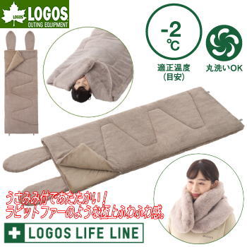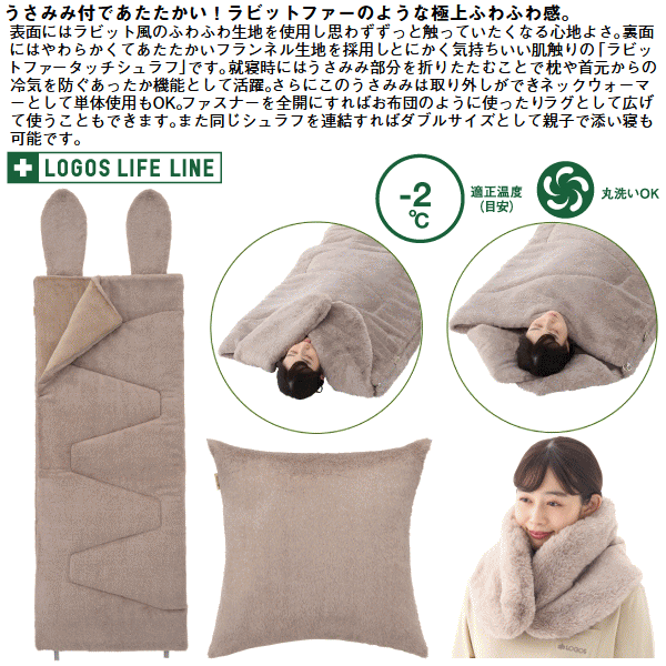 ロゴス 寝袋 シュラフ 封筒型寝袋 封筒型シュラフ うさみみ付 ラビットファータッチシュラフ 丸洗いOK 収納袋付き 連結可能 寝具 アウトドア キャンプ LOGOS 丸洗いラビットファータッチシュラフ・-2(うさみみ付)72600028