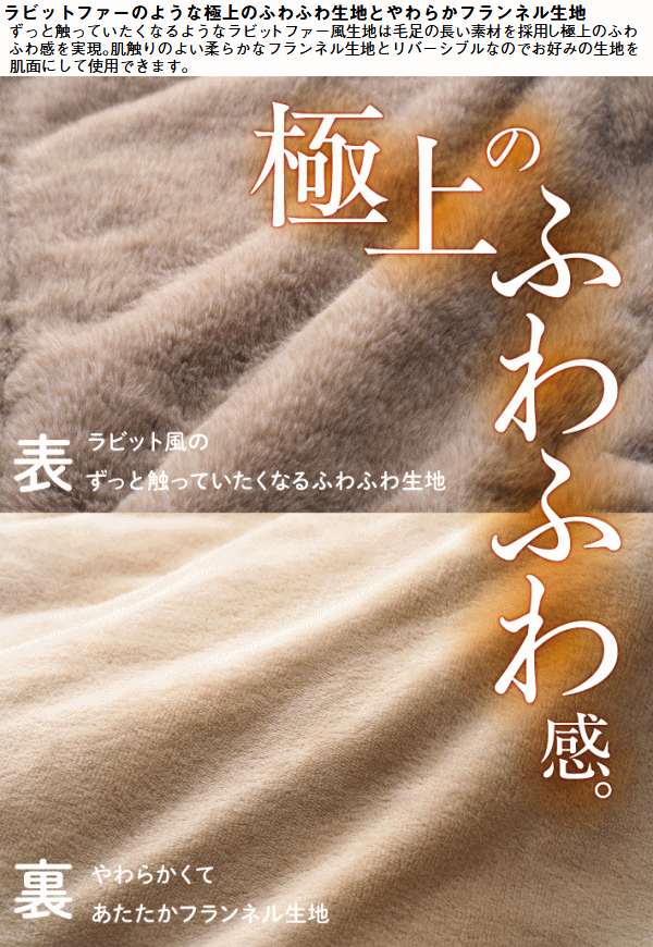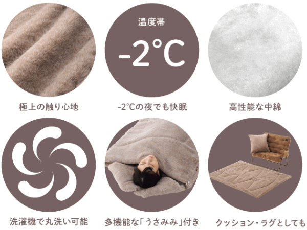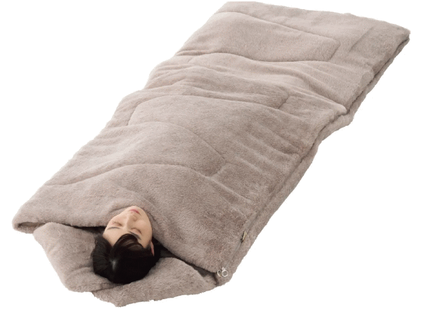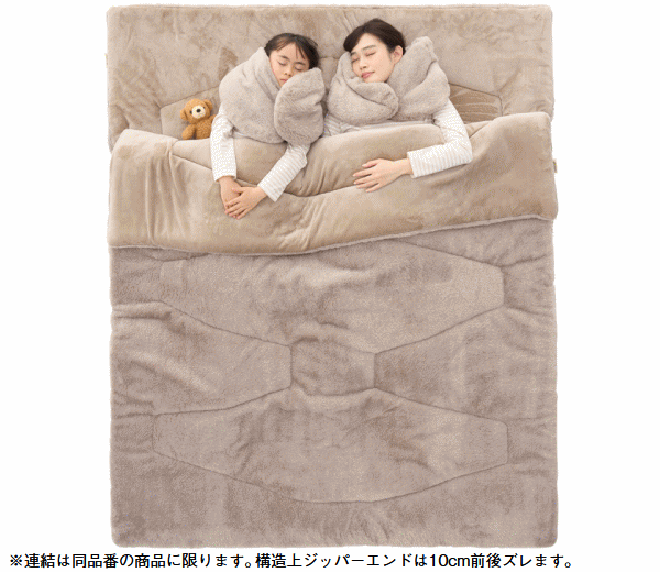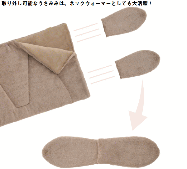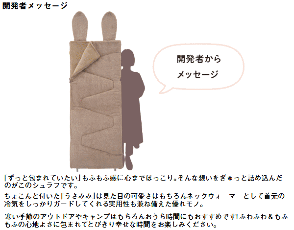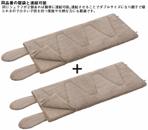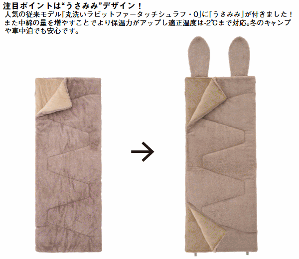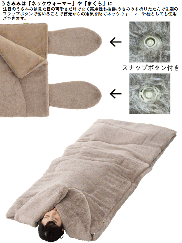 うさみみ付であたたかい!ラビットファーの様な極上ふわふわ感。表面にはラビット風のふわふわ生地を使用し思わずずっと触っていたくなる心地よさ。裏面にはやわらかくてあたたかいフランネル生地を採用しとにかく気持ちいい肌触りのラビットファータッチシュラフです。就寝時にはうさみみ部分を折りたたむ事で枕や首元からの冷気を防ぐあったか機能として活躍。更にこのうさみみは取り外しができネックウォーマーとして単体使用もOK。ファスナーを全開にすればお布団の様に使ったりラグとして広げて使う事もできます。また同じシュラフを連結すればダブルサイズとして親子で添い寝も可能。■適正温度-2℃まで■適合胸囲約120cmまで■総重量約3.6kg■サイズ約長さ190×幅80cm■収納サイズ約縦65×横65×高さ28cm■構成:本体、収納袋■主素材[表面素材]ポリエステル[肌面素材]やわらかフランネル[中綿]ダイナチューブファイバー※適正温度は製品のあたたかさを比較するための目安温度です。防寒着を着て寝ることを想定しています。連結は同品番同士に限ります。構造上ジッパーエンドは10cm前後ズレます。