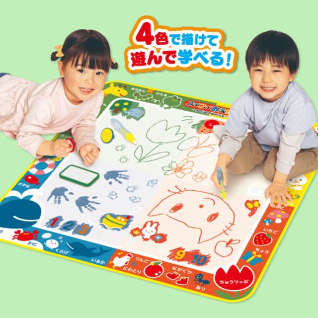 お水のペンで描くから汚れない!シートに描いた絵は乾けば消えるので何度でも繰り返し遊べます。大きなシートでのびのび描けて、ぬりえやスタンプ遊びができます。カラフルな4色のシートで色・言葉・数字を覚えられます。水道水を入れる専用ペンは、名古屋市立大学と共同研究し、人間工学に基づいた形状になっています。正しいペンの持ち方が身に付く形状なので、はじめてのペン練習にぴったり。シートは折りたためるのでお片付けも簡単です。