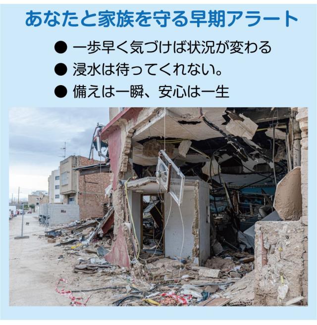 あなたと家族を守る早期浸水アラート!! ・設置するだけで浸水をいち早く知らせる ・見えない水害を"音"でキャッチ ・浸水サインを逃がさない暮らしのセンサー |