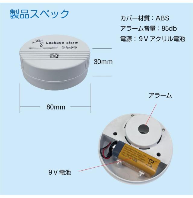 電源:9V 角形乾電池 アラーム音量:85db 本体材質:ABS樹脂 |