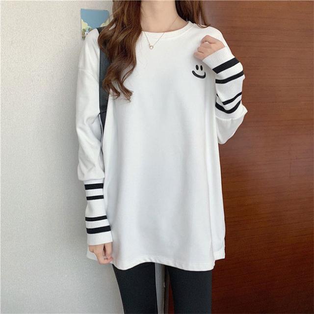 【一部即納】長袖Tシャツ レディース ロングtシャツ 長袖 春服 秋服 ゆったり ビッグシルエット ロンT トップス カットソー 笑顔 刺繍 ロングTシャツ 可愛い 韓国ファッション カジュアル 体型カバー