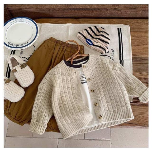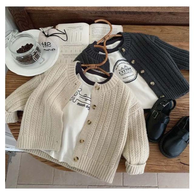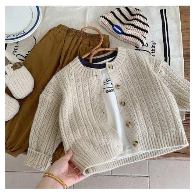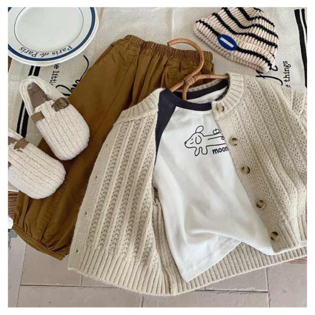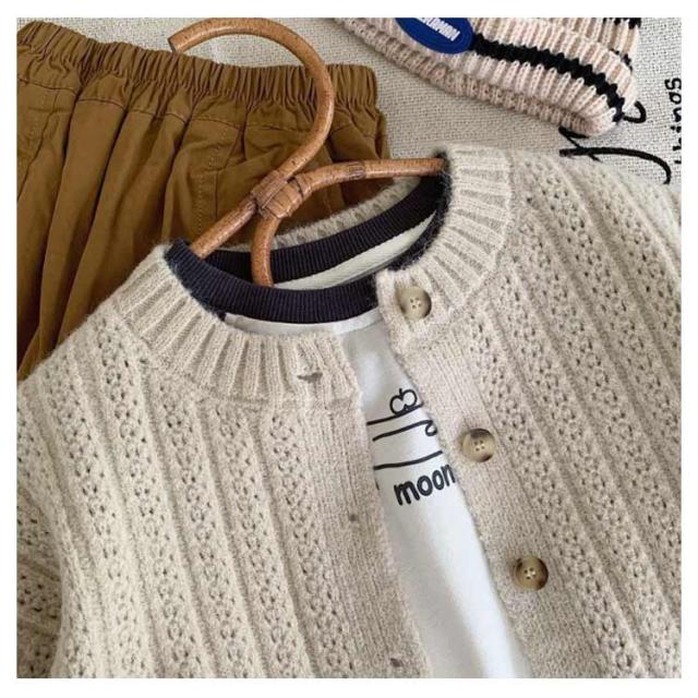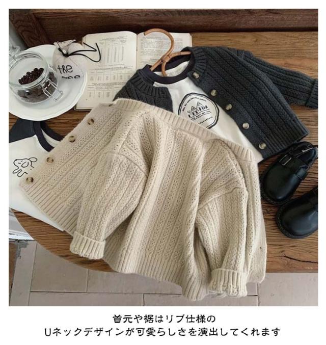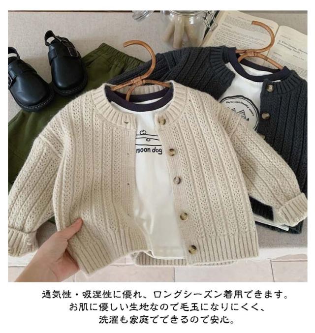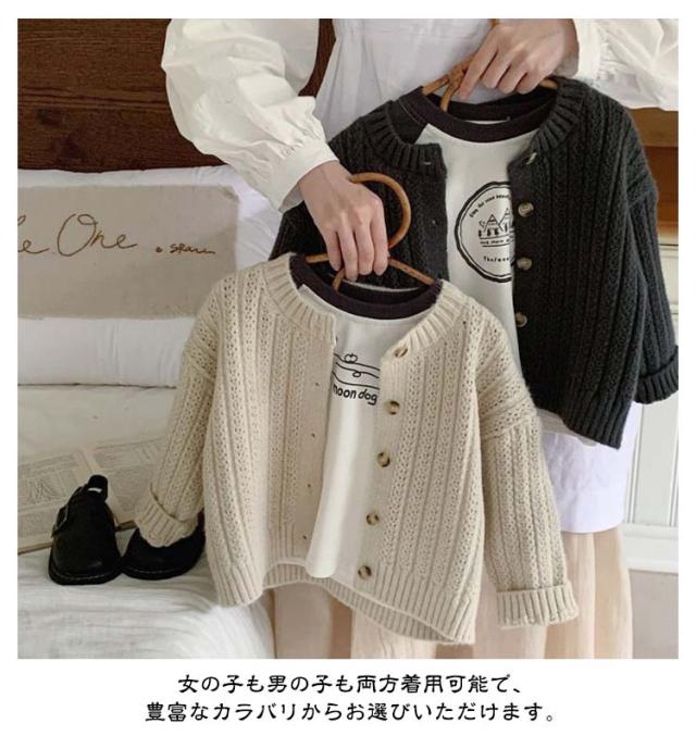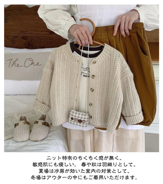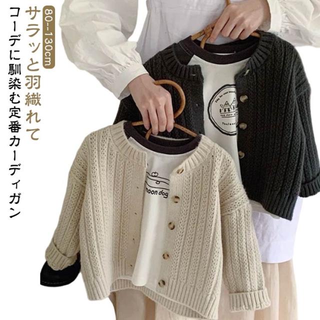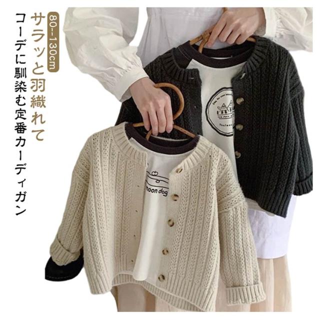 | サラッと羽織れてコーデに馴染む定番カーディガン 女の子も男の子も両方着用可能で、豊富なカラバリからお選びいただけます。 通気性・吸湿性に優れ、ロングシーズン着用できます。 お肌に優しい生地なので毛玉になりにくく、洗濯も家庭でできるので安心。 ニット特有のちくちく感が無く、敏感肌にも優しい。 春や秋は羽織りとして、夏場は冷房が効いた室内の対策として、冬場はアウターの中にもご着用いただけます。 首元や裾はリブ仕様のUネックデザインが可愛らしさを演出してくれます | |