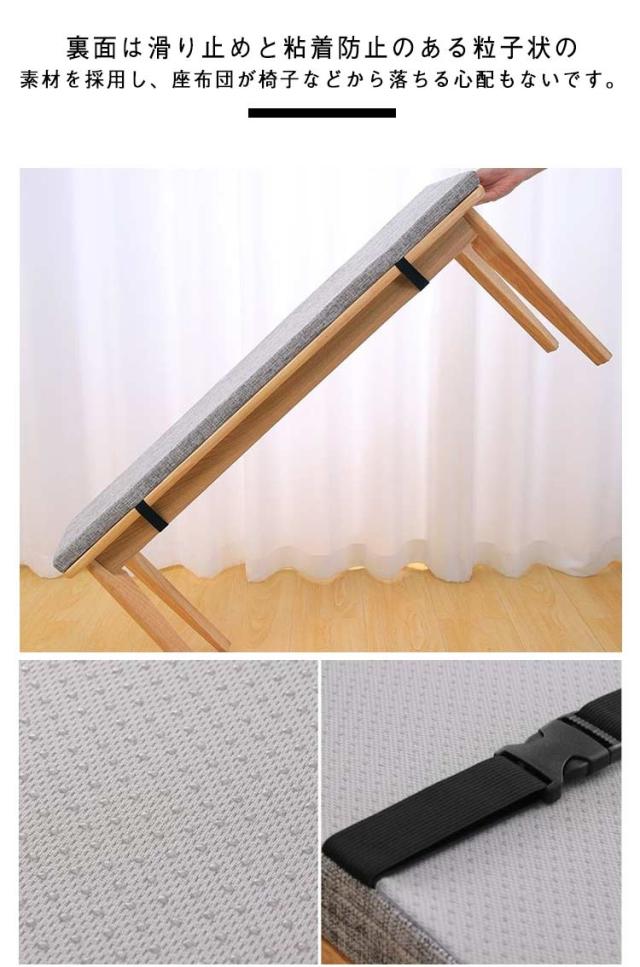 | 4サイズ×全11色!ベンチシートクッション どんな部屋でも馴染み、オールシーズン使えられるベンチクッション。 2cmの厚みで座る時に、体圧を分散して身体を柔らかく支えることができ、長時間の座り作業でもお尻は疲れません。 裏面は滑り止めと粘着防止のある粒子状の素材を採用し、座布団が椅子などから落ちる心配もないです。 高密度のスポンジでできており、回復性がよく、身体を柔らかく支えることができます。 カバーはファスナー仕様で、汚れたらすぐ取り外して洗濯機で洗えます。 ベルトがあるので、椅子にしっかりと固定されて移動しにくい。 ふかふか生地で座り心地良い、寒い日でも冷たさを感じず、心地よい温もりが広がります。 周りの家具とバランス良く馴染んでいます。部屋の模様替えやインテリア飾りとしてぴったり。 | |