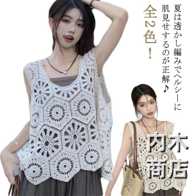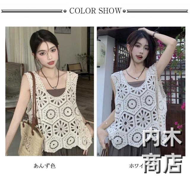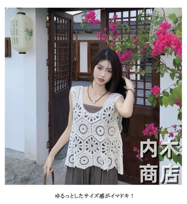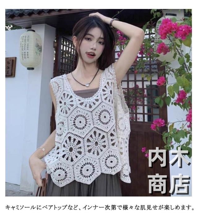 送料無料 かぎ編み ニットベスト 大人かわいい クロシェ編み トップス 無地 ネック きれいめ ベスト カジュアル フェミニン 透かし編み レイヤード トップス ベスト カジュアル 春 夏 無地 プルオーバー