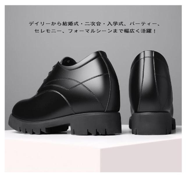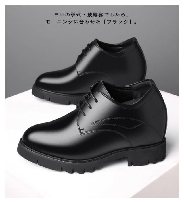 | 12cm身長アップ シークレットシューズ 大事な娘さんの結婚式でお父さんと歩くバージンロード。ウェディングドレスでは7cm〜11cmのヒールを履く事が一般的ですので、場合によってはお父さんの方が小さくなってしまいます。せっかくの晴れの舞台なので、お父さんもカッコよく娘さんをエスコートしたいですよね。 アッパーには合成皮革、合成繊維を使用。質感が良く足になじみやすくなっております。 日中の挙式・披露宴でしたら、モーニングに合わせた「ブラック」。 デイリーから結婚式・二次会・入学式、パーティー、セレモニー、フォーマルシーンまで幅広く活躍! | |