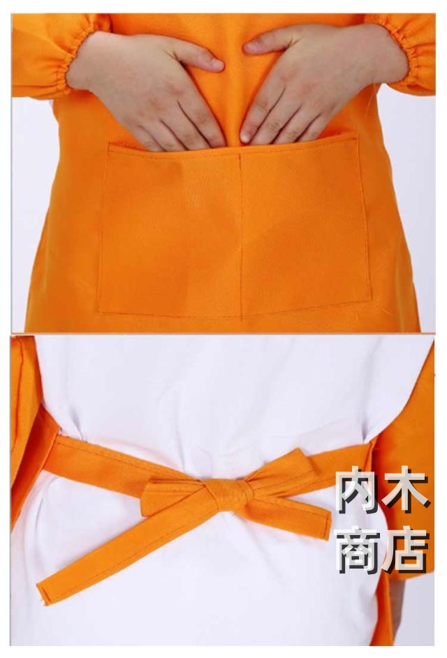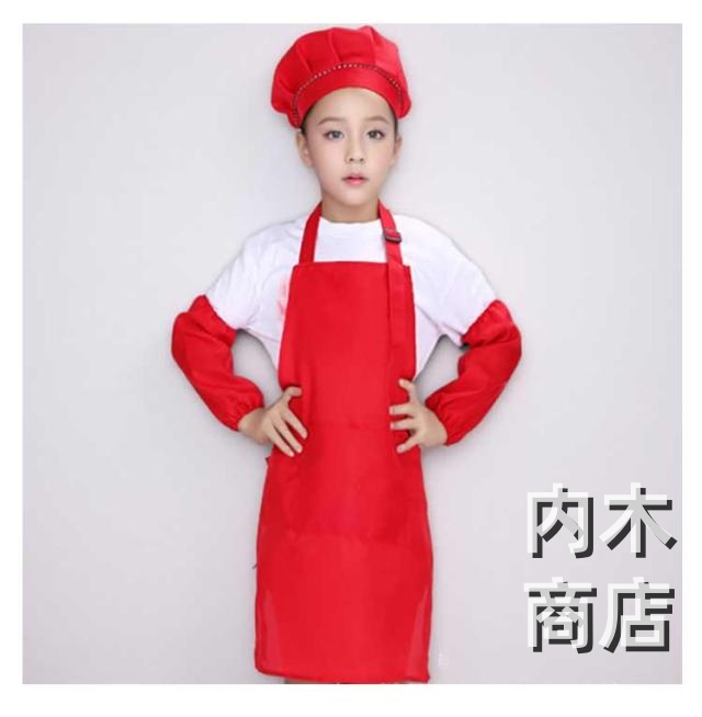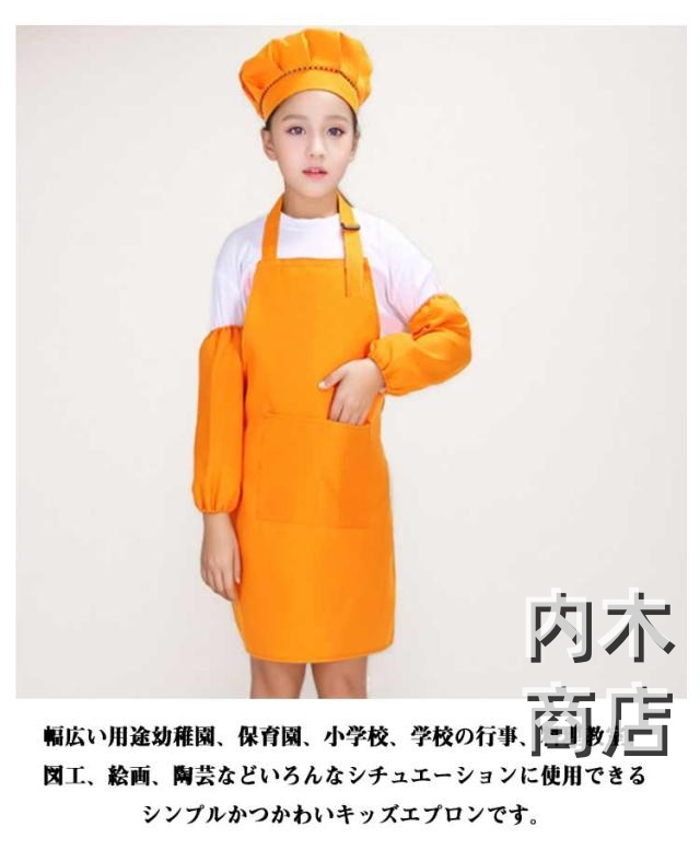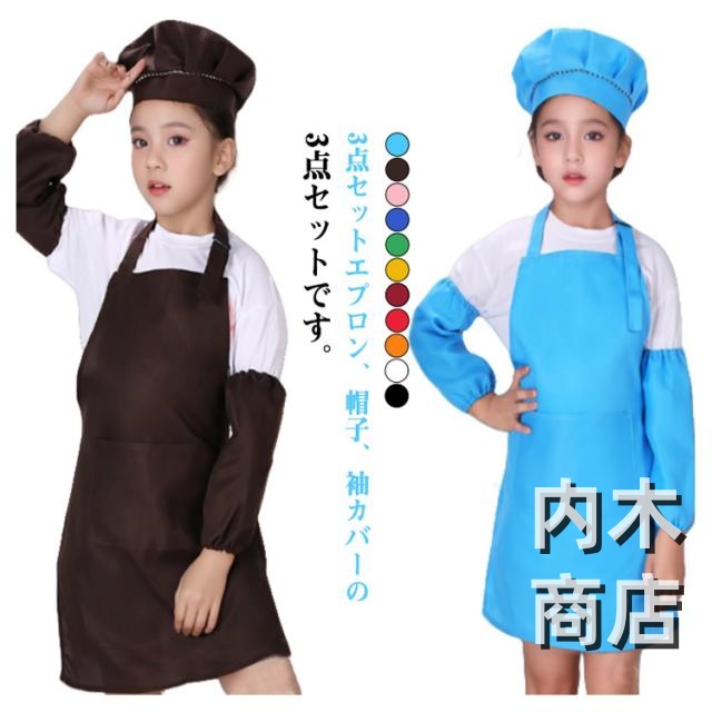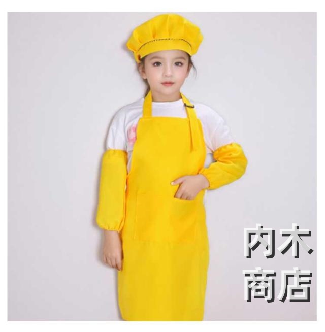 | 3点セットエプロン、帽子、袖カバーの3点セットです。 幅広い用途幼稚園、保育園、小学校、学校の行事、料理教室、図工、絵画、陶芸などいろんなシチュエーションに使用できるシンプルかつかわいキッズエプロンです。 | |