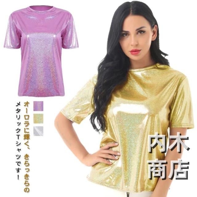 | オーロラに輝く、きらっきらのメタリックTシャツです! 普段使いにはもちろん、ダンスの衣装やイベントにも♪インスタ映えします♪ ストレッチ性のあるつるつるとした素材。薄手なので、サラッと軽く着心地◎ ラメとは違った輝きのある華やかな生地がとてもゴージャス! 光の当たりかたで多色に見えます。チームや団体でお揃いで着用できます! | |