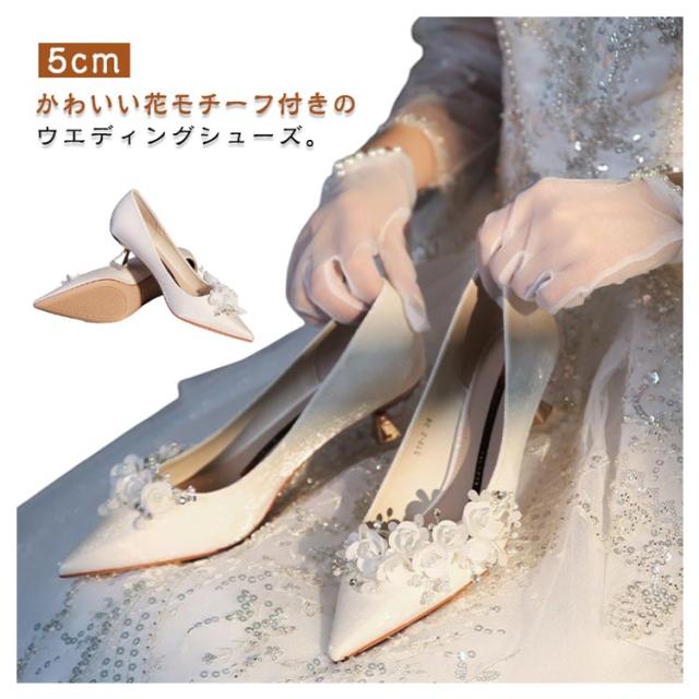 ブライダルシューズ ドレスシューズ ローヒール ウエディングシューズ キラキラ 5cmヒール 優雅 パンプス ブライダルシューズ 結婚式 ウエディング ポインテッドトゥ 韓国風 疲れない お花付き シューズ 花嫁 靴 痛くない エレガント 挙式 披露宴 発表会 演奏会 パーティー