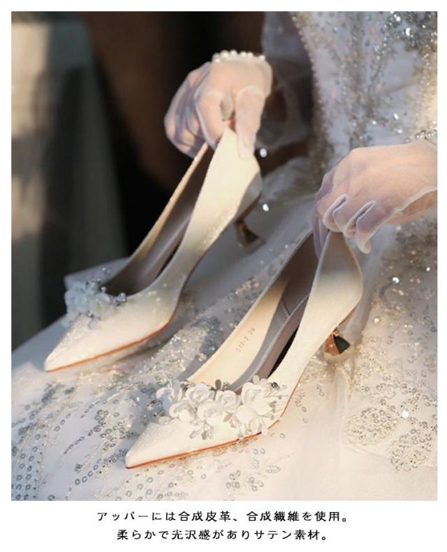 | かわいい花モチーフ付きのウエディングシューズ。【5cm】 アッパーには合成皮革、合成繊維を使用。柔らかで光沢感がありサテン素材。 つま先がポインテッドの形をしているので、足元を華奢にキレイに見せます。 ヒール高5cmピンヒールは美脚効果はありつつも適度な高さのヒールで高いヒールが苦手な方にもおすすめです。 デイリーから結婚式・二次会・入学式、パーティー、セレモニー、フォーマルシーンまで幅広く活躍! | |