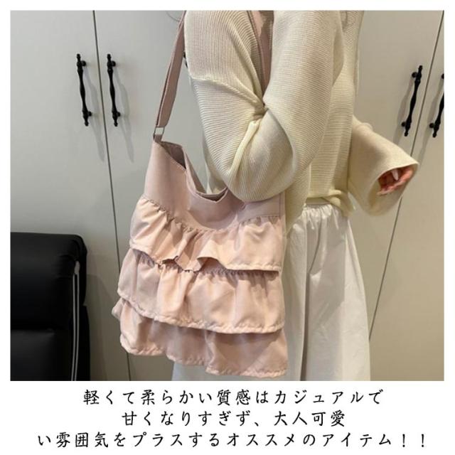 | 大注目のトレンドITEM!大きめのフリルが可愛いトートバッグです。 バッグ全体にあしらったボリュームのあるフリルが、コーディネートを華やかに仕上げます。 柔らかな素材と立体的なティアードフリルが、優美でロマンティックなムードをプラス。 肩掛けがしやすい長めの持ち手とA4サイズに対応しているので、普段使いはもちろんのこと、お仕事用としてもおすすめです♪ 軽くて柔らかい質感はカジュアルで甘くなりすぎず、大人可愛い雰囲気をプラスするオススメのアイテム!! | |