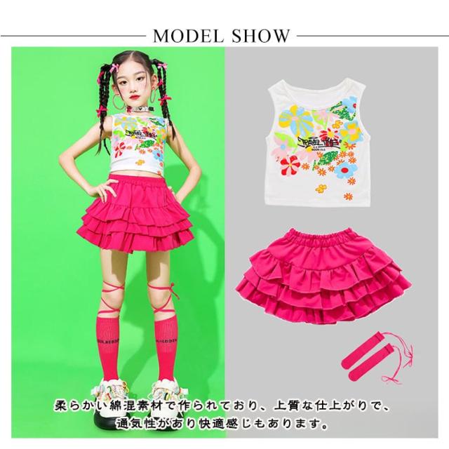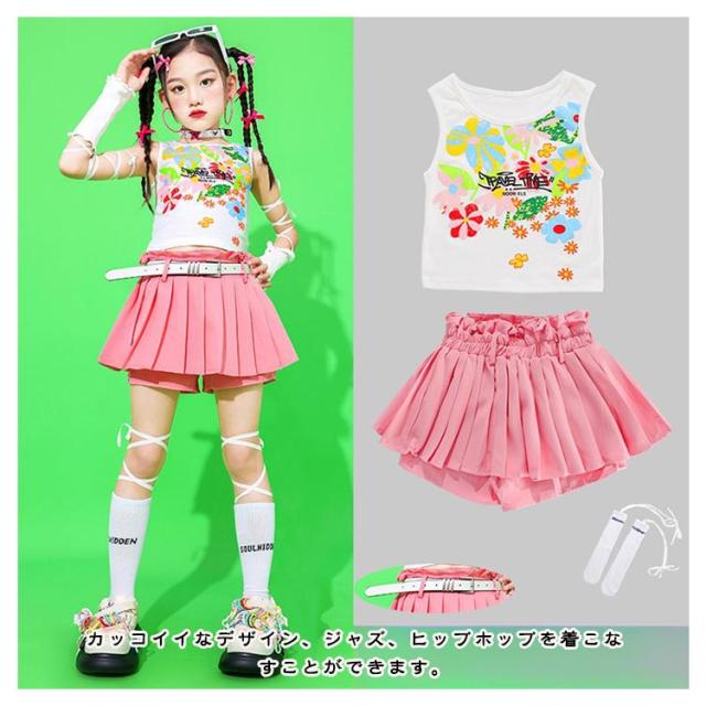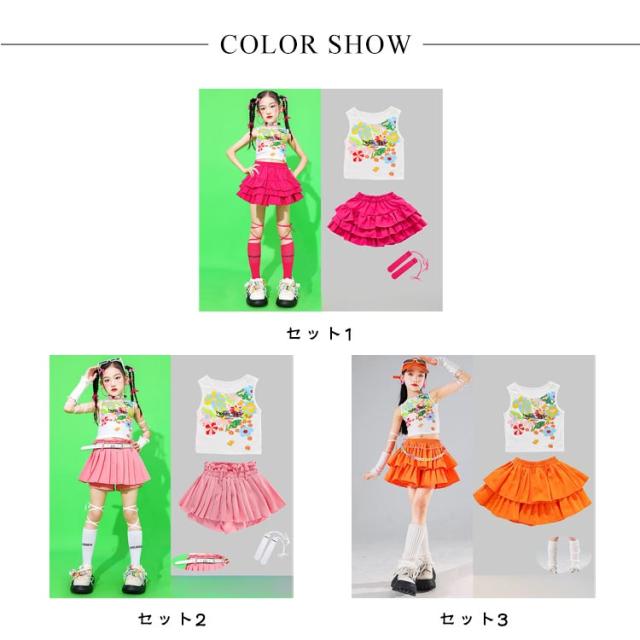 ダンス衣装 タンクトップ カラフル ヒップホップ へそ出し ダンス 女の子 子供 スカート セットアップ クロップド丈 トップス チアガール ダンスウェア キッズ チュチュスカート キッズ チア 韓国 K-POP HIPHOP 演出服