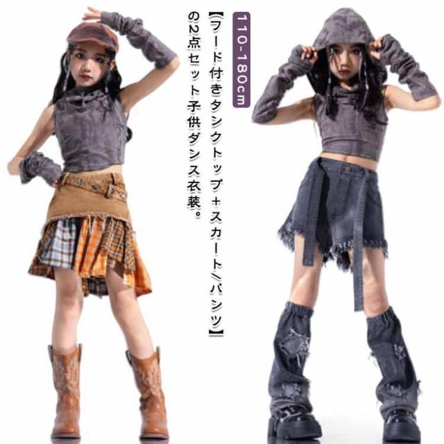 キッズ ジャズダンス ヒップホップ ワイドパンツ ダンス衣装 チアガール k-pop キッズダンス衣装 韓国 チア 女の子 セットアップ フード付き 子供服 ヘソ出し キッズ トップス スカート パンツ 砂色 グレー jazz hiphop
