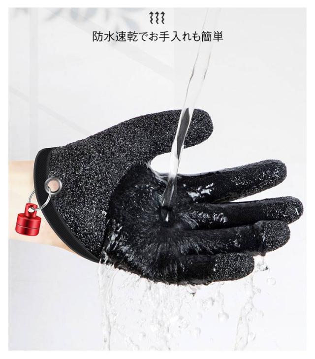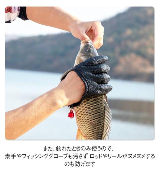 | 【魚専用グローブ】【片手用】【マグネットリリーサー付き】 滑り止め効果のある凹凸加工を施した、片手用(1個)フィッシンググローブです。 魚を捌く際に臭いが手についちゃう悩みを解消する手袋です。 着脱しやすく便利なマグネットリリーサー付き☆ マグネットリリーサー付きでパンツや釣りバッグ、 フィッシングベストに吊るしておけてすぐ出せる! また、釣れたときのみ使うので、 素手やフィッシンググローブも汚さず ロッドやリールがヌメヌメするのも防げます♪ 防水速乾でお手入れも簡単♪ | |