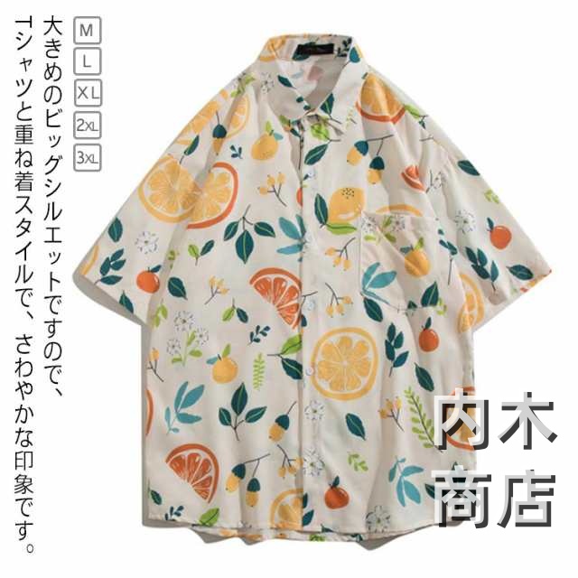 総柄 ハワイアン レモン柄 ゆったり シンプル レディース オレンジ カジュアル 旅行 果物柄 ストリートリゾート メンズ 海 体型カバー アロハシャツ アロハシャツ ビーチ 5分袖 開襟シャツ 夏物 ヴィンテージ風 男女兼用 可愛い 大きいサイズ