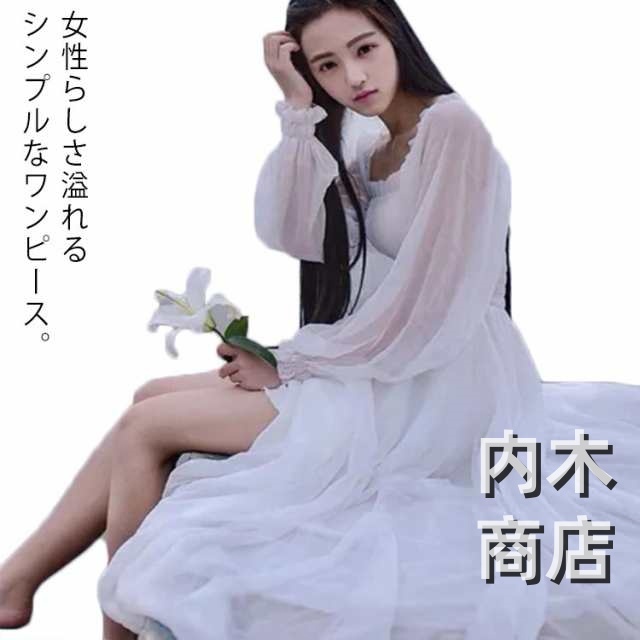 即納OK 売上急増中 旅行 パーティードレス マキシ丈 優雅 白ワンピース ロングワンピース ドレス リゾート シースルー マキシワンピ ロングドレス 無地 ふわふわ 長袖 ボリュームスリーブ ハイウエスト フレアワンピ シフォン 海デート 今だけ限定