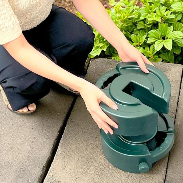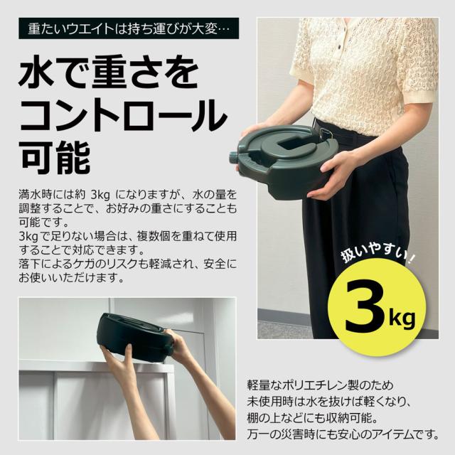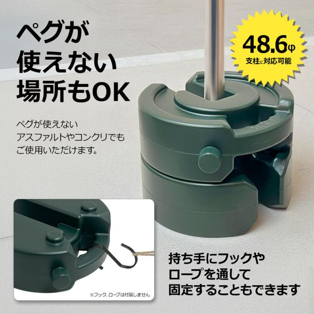 また積み重ねて使える設計で、必要に応じて重さを調整できるためテントや日除けシェードの風対策や倒れ防止にも安心してご利用いただけます。(1個あたり満水時約3kg)