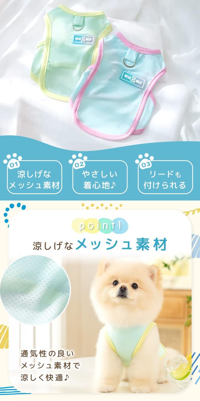 タンクトップ/犬用/犬服/夏服/春夏/ペットウェア/ドッグウェア/メッシュ/涼しい/ひんやり/涼感/涼しげ/通気性/着心地/おしゃれ/かわいい/無地/シンプル/伸縮性/軽量/洗える/洗濯OK/快適/お出掛け/散歩/旅行/リード/ハーネス/ベスト/シャツ/スポーツウェア/トイプードル/ポメラニアン/チワワ/ヨーキー/マルチーズ/小型犬/中型犬/大型犬/Sサイズ/Mサイズ/Lサイズ/ミントグリーン/アイスブルー/ペット/用品