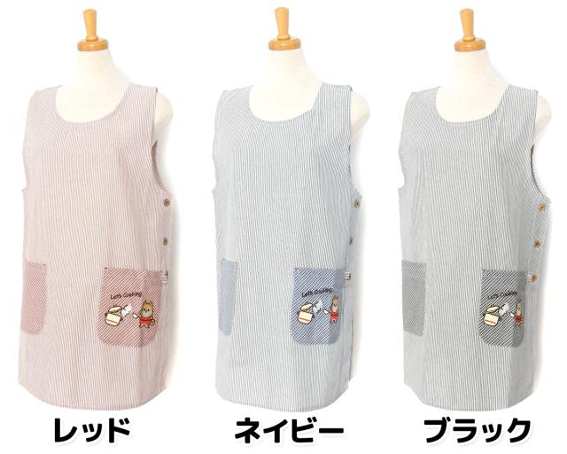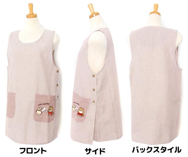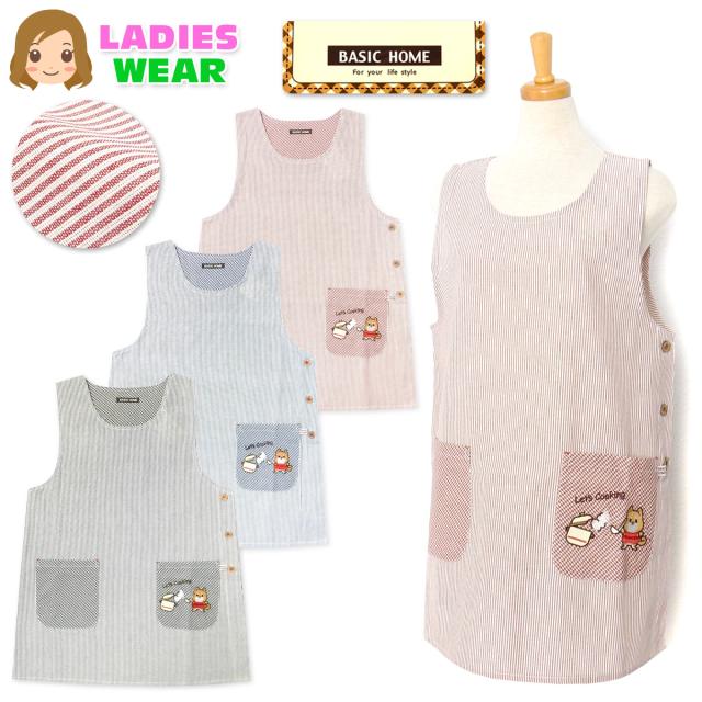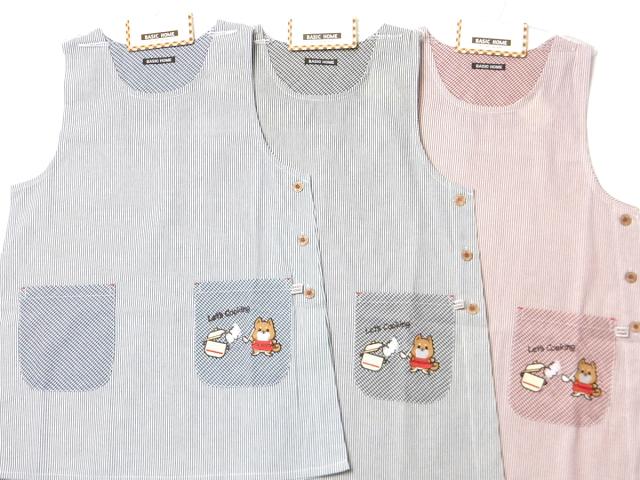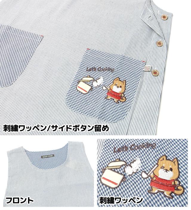 【送料無料】婦人 レディース ボックス型 エプロン サイドボタン留め ストライプ柄 いぬ刺繍ワッペン ポケット付き sl-0642【メール便対応】