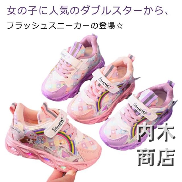 | 女の子に人気のダブルスターから、フラッシュスニーカーの登場☆ 跳んで走って、サイドのラインをキラキラさせちゃおう♪ レインボーカラー使いで、華やかな足元に。 お外に出るのが、楽しみになりますね。 かわいい?が大スキなお子さまにどうぞ。 | |