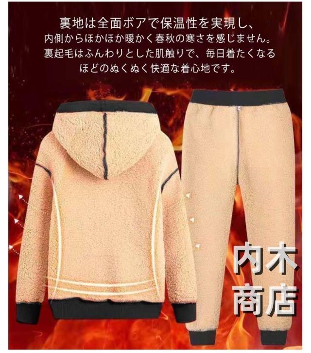 | 4タイプが選べる!裏ボアパーカーの2点上下セット?br>裏地は全面ボアで保温性を実現し、内側からほかほか暖かく春秋の寒さを感じません。裏起毛はふんわりとした肌触りで、毎日着たくなるほどのぬくぬく快適な着心地です。 ややゆったりとしたシルエットで、リラックススタイルを実現?br>パンツはウェストゴム仕様で楽チン。 セットアップとして着用するのはもちろんのこと、別々でも着用していただけます。 アウトドアやスポーツ、部屋着まで幅広くお使いいただけます。 | |