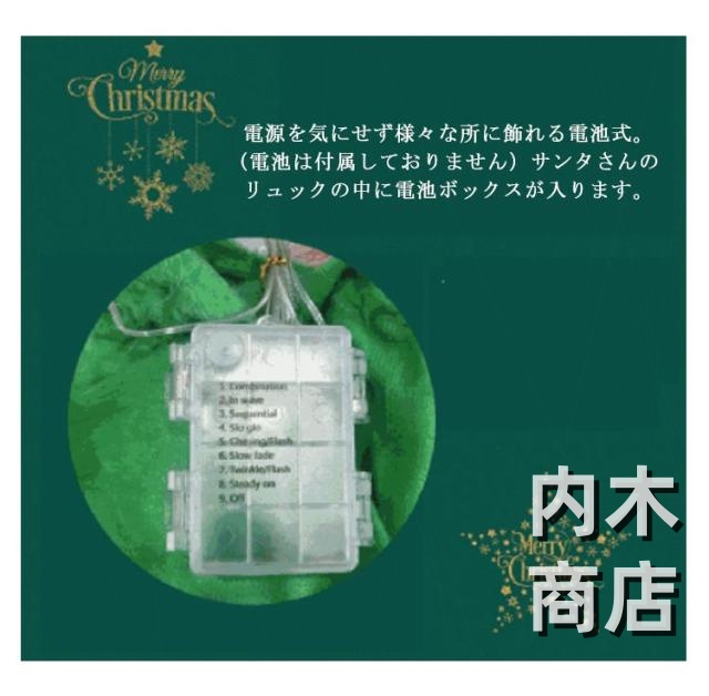 | 【商品名】LEDイルミネーションライト 【素材】ポリエステル、LED、その他 【サイズ】サンタ約170cm 【点灯パターン】8パターン 【特徴】 サンタさんが壁を登ってこっそりとプレゼントを届ける姿が可愛いモチーフライト◎ 好きな場所に飾って、周りの雰囲気がクリスマスムードに♪ 暖かい光は、ロマンチックで楽しい気分を盛り上げて、家族や友達と素晴らしいクリスマスの雰囲気を楽しめます。 ご自宅だけでなく、ショップ、学校、ホテルなどでもご利用頂いているデコレーションです。 電源を気にせず様々な所に飾れる電池式。(電池は付属しておりません)サンタさんのリュックの中に電池ボックスが入ります。 サンタさんの両手にストラップと両面テープがついているのでどんな場所でも簡単に設置可能です。 | |