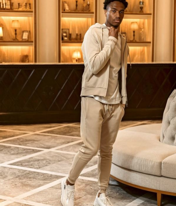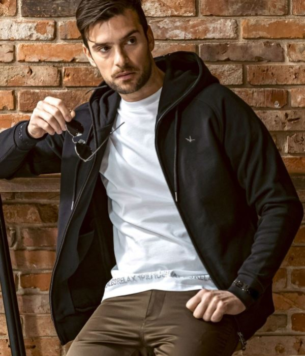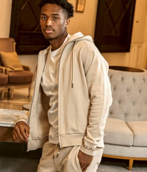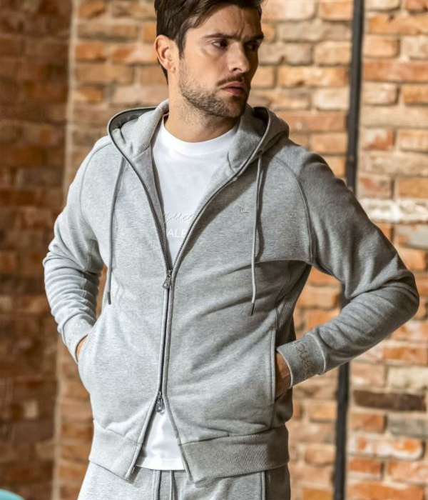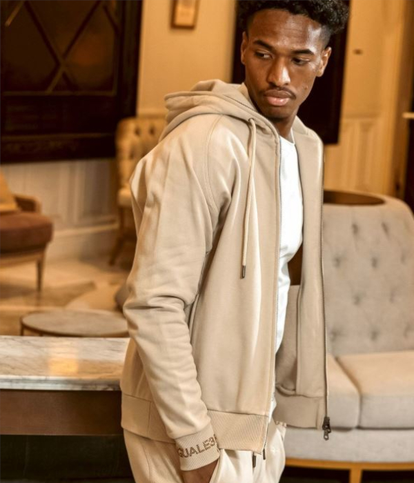 袖口にブランドロゴをラインストーンでデザインしたジップアップフーディー。