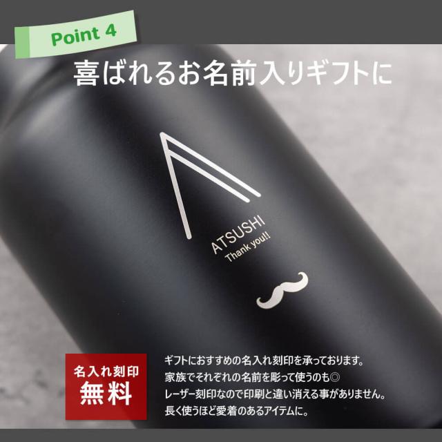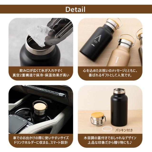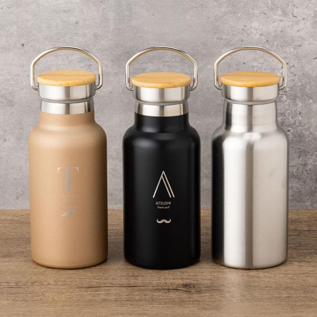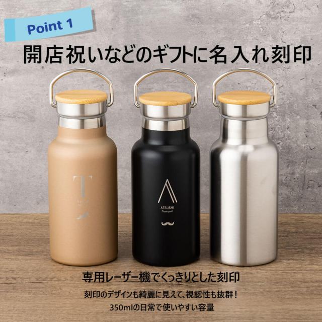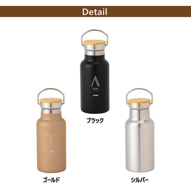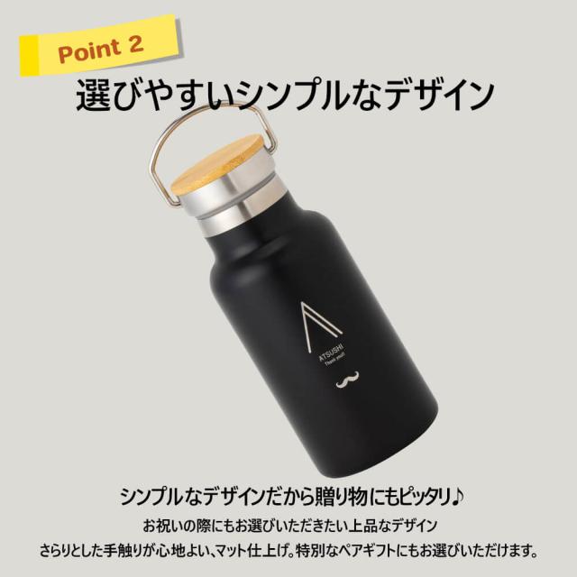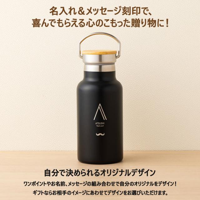 | 商品詳細 | ハンドル付きで持ち運びやすい350mlの名入れ水筒。真空断熱で保温・保冷OK。 名前入りで特別感たっぷり、シンプルでギフトにぴったりです。 |