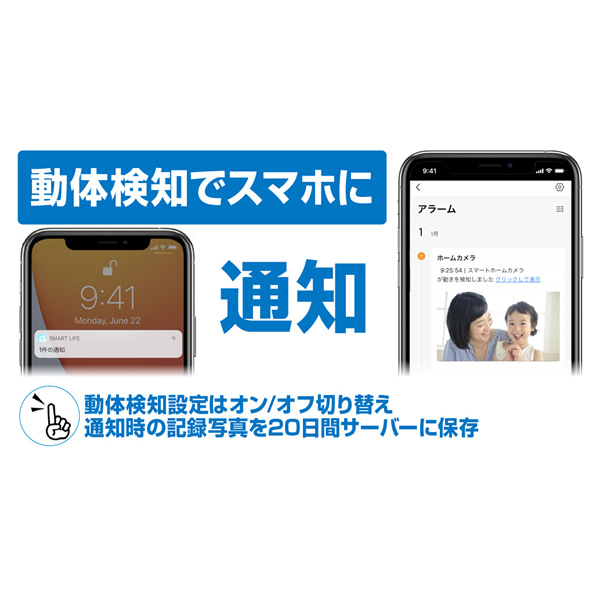 ●動体通知で記録写真撮影とスマホへの通知が可能。