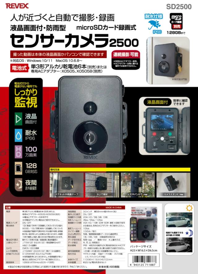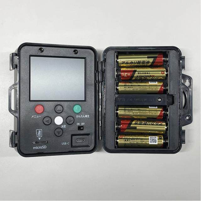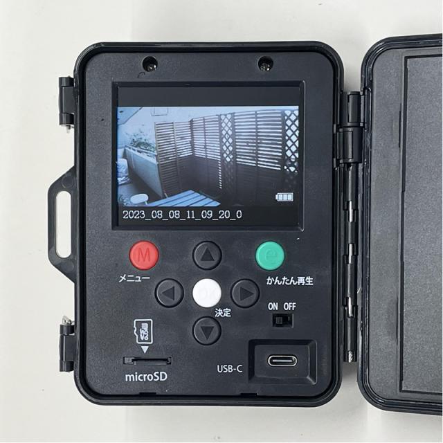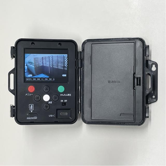 侵入者やストーカーを感知するとその場でmicroSDカードに自動録画します。 液晶画面付きなので、パソコン無しでも録画した画像を確認できます。 ※パソコンでも確認できます。(対応OS:windows10〜/MacOS10.6.8〜) ■電源:単3形アルカリ電池6本(別売)、又は、ACアダプター X0505(白1.8m)/X0505B(黒3m)(別売) ■電池寿命:動画(15秒)を1日10回録画して約3カ月(夜間撮影が多い場合は赤外線LED点灯のため短くなります) ■録画媒体:128GBまでのmicroSDカード(別売) ■カメラ:CMOS-最大100万画素(2段階切り替え可能) ■液晶画面:3インチ ■動画撮影時間:15秒・30秒・60秒・連続(切り替え可能) ■本体サイズ:W11.3×H11.5×奥行5.7cm ■本体重量:257g(電池を含まない) ■素材・材質:ABS樹脂 ■生産国:中国 ※記載は商品仕様の一部です。仕様説明不足等の理由での返品はできません。特に適合等は必ずご確認ください。