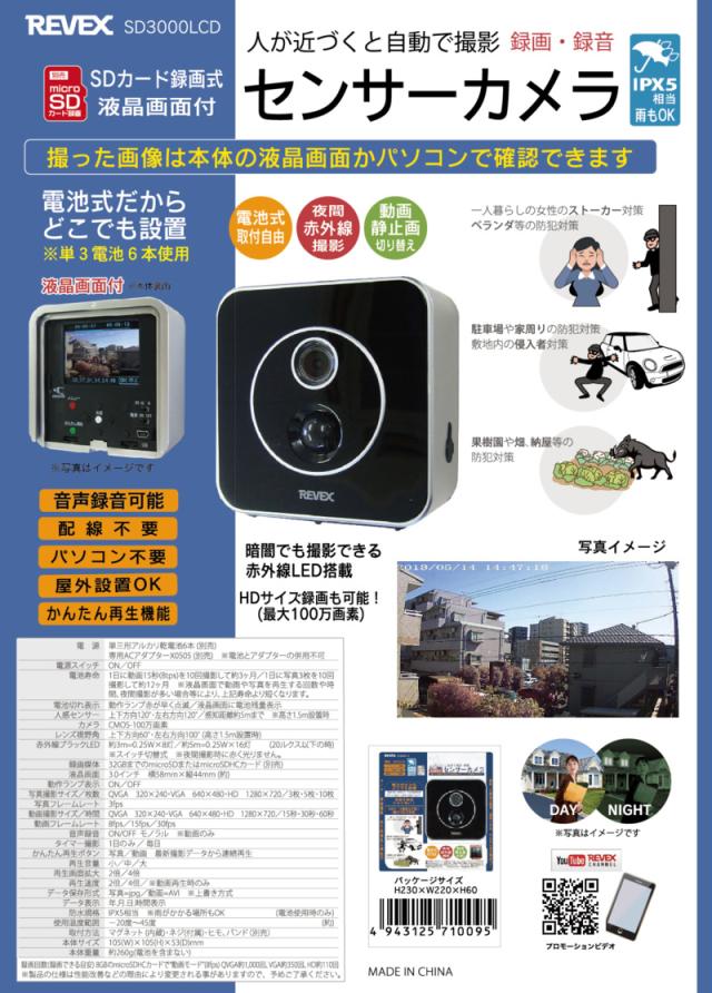 センサーカメラ リーベックス 液晶画面付き SDカード録画式センサーカメラ REVEX SD3000LCD