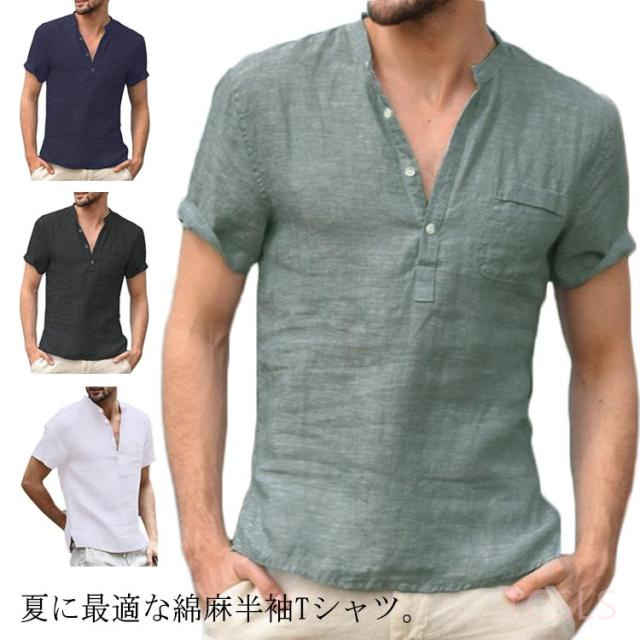 全7色×8サイズ!メンズ 半袖 リネン風Tシャツ Vネック 綿麻風Tシャツ Tシャツ メンズ 夏物 半袖Tシャツ リネン ボタン付き カットソー 春夏 ナチュラル リゾート S M L XL 2XL 3XL 4XL 5XL
