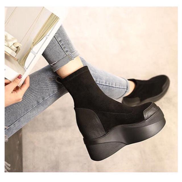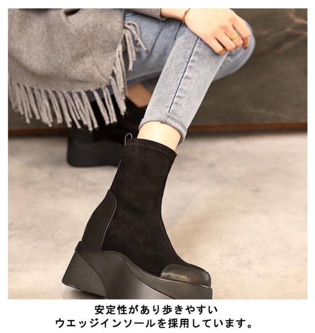 ショートブーツ 厚底ブーツ ウェッジソール ハイヒール インソール ブーツ スエード ソックスブーツ 美脚 ストレッチブーツ 靴 ラウンドトゥ ブラック 薄手 裏毛 歩きやすい 痛くない レディース靴 疲れない ブーツ 通勤