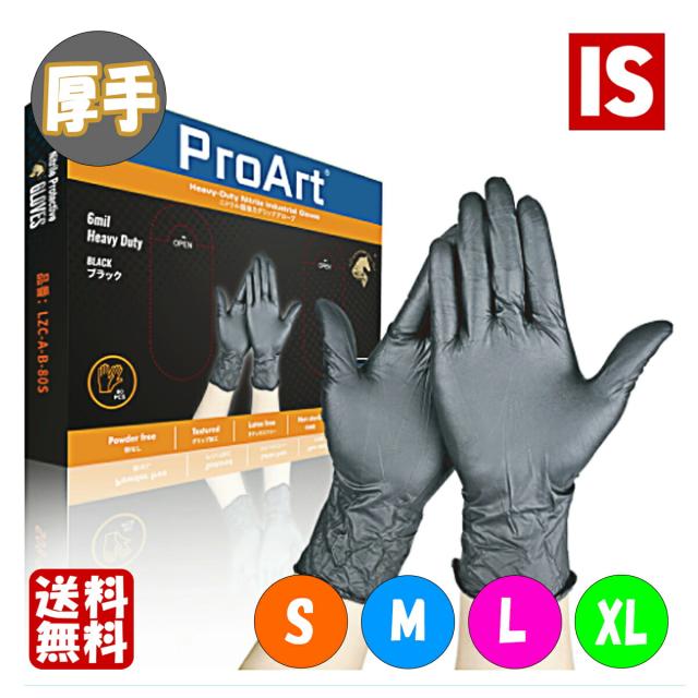【レビュー特典あり】 送料無料 PROART ニトリル手袋 ブラック 黒 厚手 80枚入 厚さ:0.15mm 食品衛生法適合 ニトリルグローブ 使い捨て手袋 超強力グリップ パウダーフリー 左右兼用 家庭用 工業用 作業用 S M L サイズ