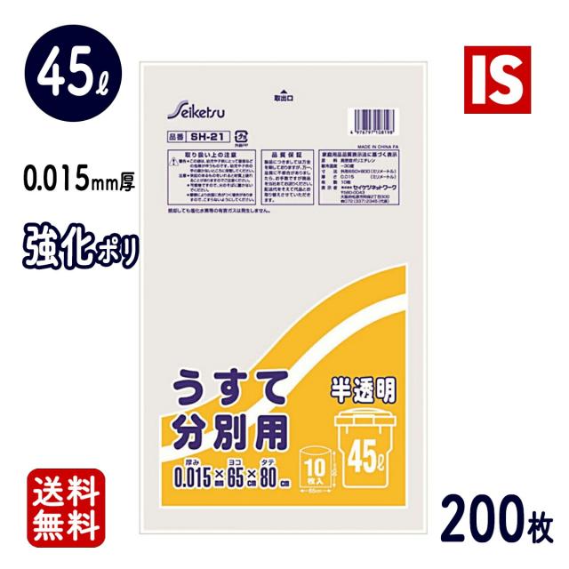 ゴミ袋 45l 200枚 半透明 SH-21 0.015mm厚 650X800 10枚X20冊 HDPE 送料無料 45リットル ごみ袋 ポリ袋 エコ袋 即納 即日発送 セイケツネットワーク アイエスショップ