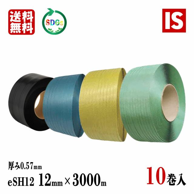 送料無料 10巻 PPバンド 青 黄 緑 黒 eSH12 幅12mm X 3000 m リサイクル 厚み0.57mm 手芸 バッグ 国産 梱包バンド 結束ヒモ 梱包機 グリーンプラ アイエスショップ