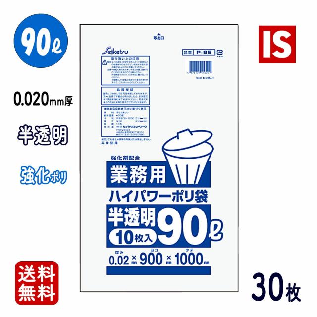【レビュー特典あり】 1000円ポッキリ P-95 ゴミ袋 90l 半透明 30枚 0.02mm厚 90cmx100cm 10枚X3冊 送料無料 HDPE 90リットル ごみ袋 ポリ袋 エコ袋 セイケツネットワーク アイエスショップ