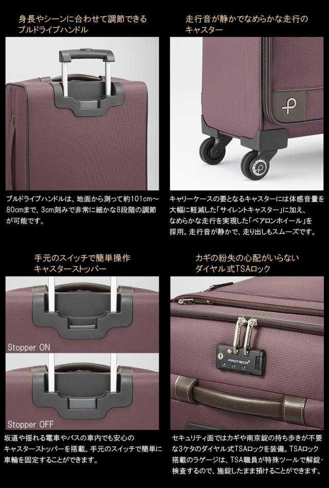機能一覧:4輪/サイレントキャスター/ベアロンホイール/TSAダイヤルファスナーロック/キャスターストッパー/国内100席以上・国際機内持込み