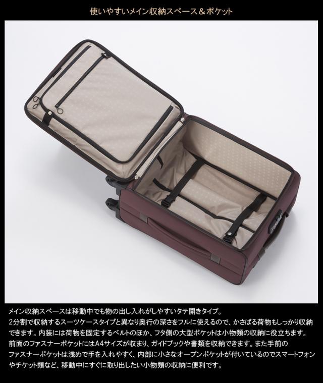 メイン収納スペースは移動中でも物の出し入れがしやすいタテ開きタイプ。 2分割で収納するスーツケースタイプと異なり奥行の深さをフルに使えるので、かさばる荷物もしっかり収納できます。内装には荷物を固定するベルトのほか、フタ側の大型ポケットは小物類の収納に役立ちます。 前面のファスナーポケットにはA4サイズが収まり、ガイドブックや書類を収納できます。また手前のファスナーポケットは浅めで手を入れやすく、内部に小さなオープンポケットが付いているのでスマートフォンやチケット類など、移動中にすぐに取り出したい小物類の収納に便利です。