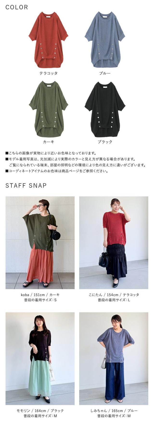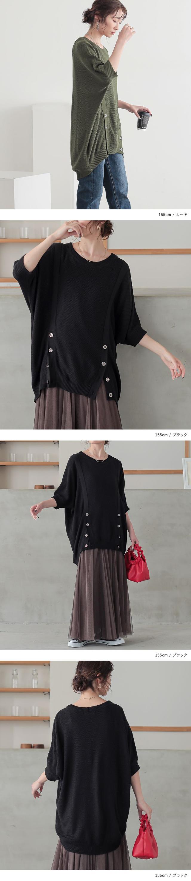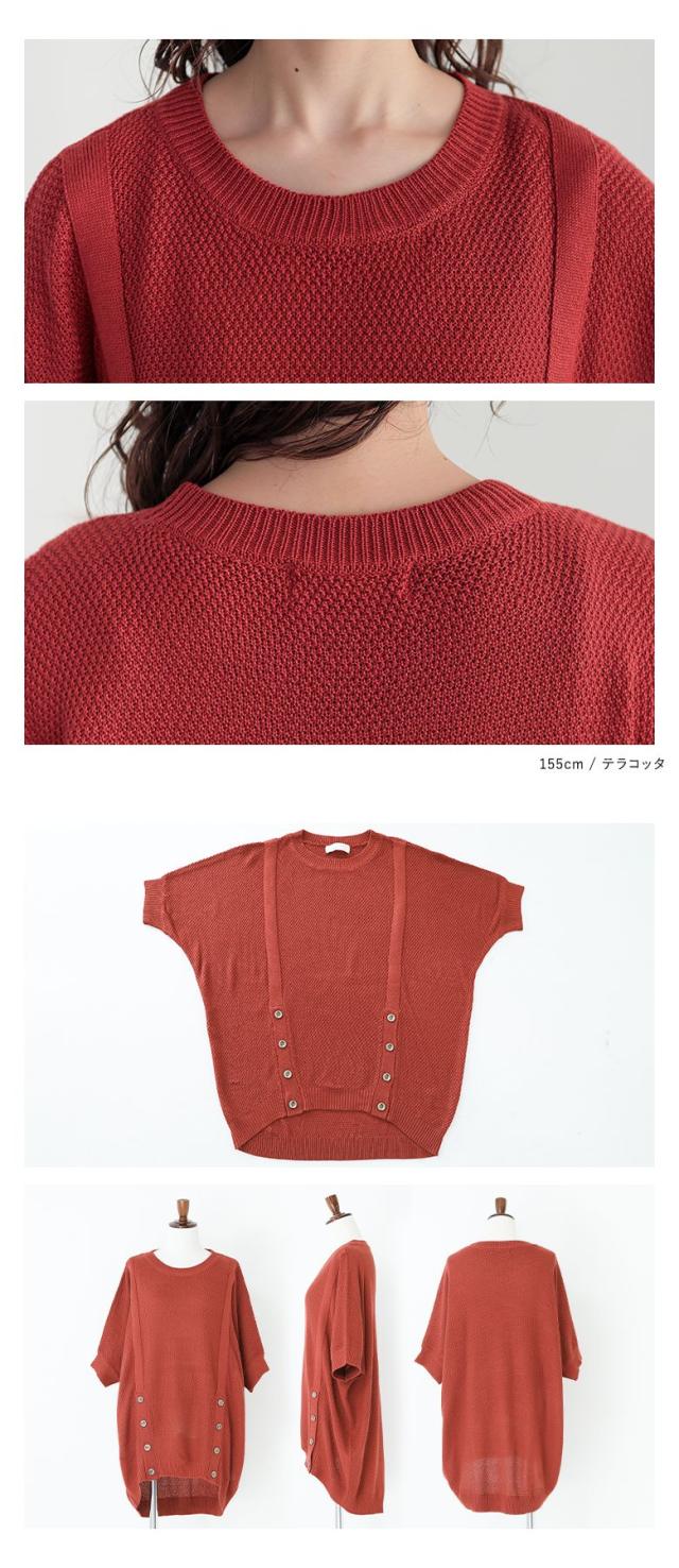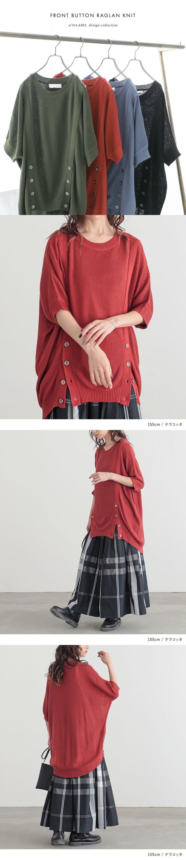 『フロント釦ラグランニット』【メール便不可】【20】[ニット 半袖 五分袖 レディース トップス ラグラン カノコ編み アレンジ ヒップが隠れる 二の腕カバー アクセントカラー 春 夏 秋]