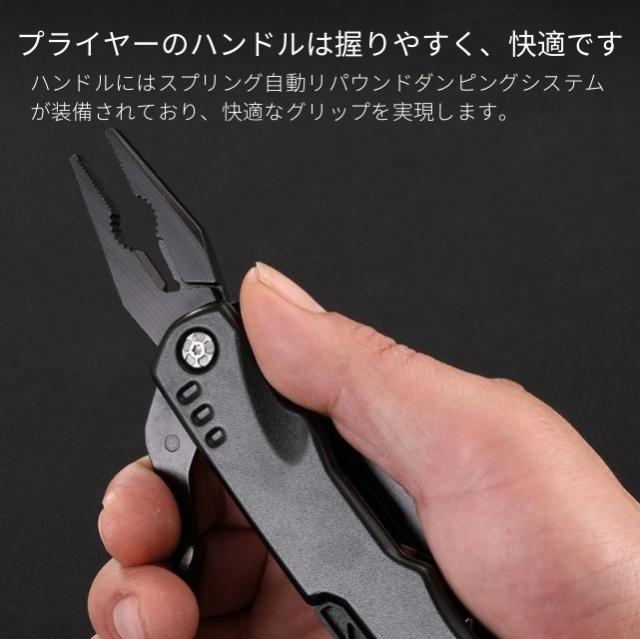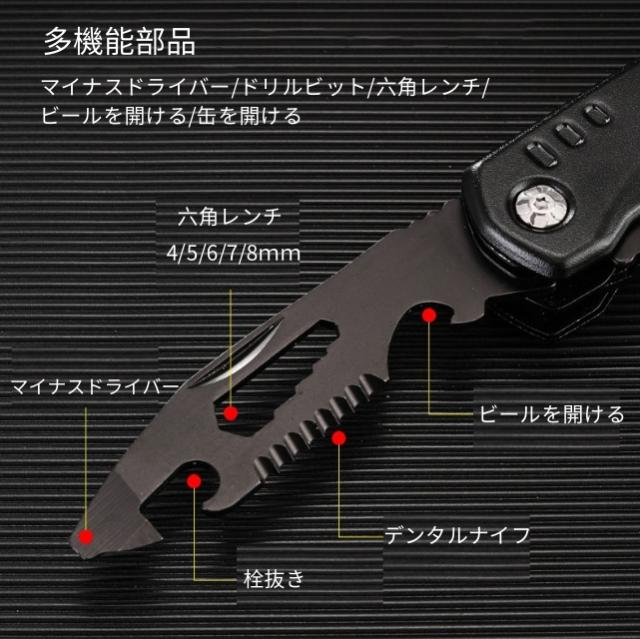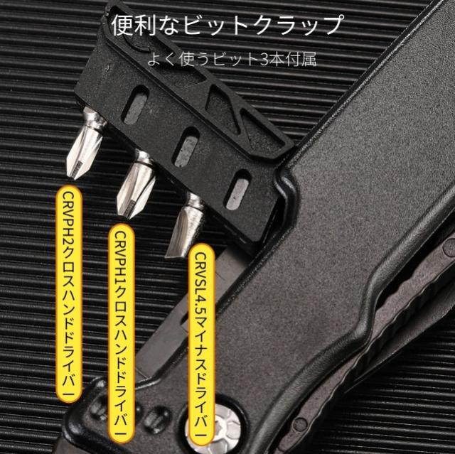 ◆ペンチ、ワイヤーカッター、ボトルオープナー、メス、六角レンチ 4/5/6/7/8mm、マイナスドライバー、栓抜き、デンタルカッター、六角レンチ、ハンマー、ビット取り付け穴、ネイルリムーバー、ビットホルダー、PH2 プラスドライバー、PH1 プラスドライバー、SL4.5 マイナスドライバー、ペンチハンドル